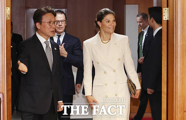 [더팩트ㅣ임영무 기자] 김민석 국무총리(왼쪽)가 15일 오후 서울 종로구 정부서울청사에서 스웨덴 왕위 계승권자로 방한한 빅토리아 잉그리드 알리스 데씨리에 스웨덴 왕세녀와 면담을 위해 입장하고 있다.