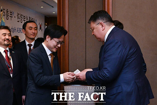 [더팩트ㅣ서예원 기자] 김정관 산업통상부 장관(왼쪽)과 카낫 보줌바예프(Kanat Bozumbayev) 카자흐스탄 부총리가 15일 오후 서울 중구 롯데호텔 서울에서 열린 '한국 산업통상부장관-카자흐스탄 부총리 회담'에 참석해 회담에 앞서 인사를 나누고 있다.