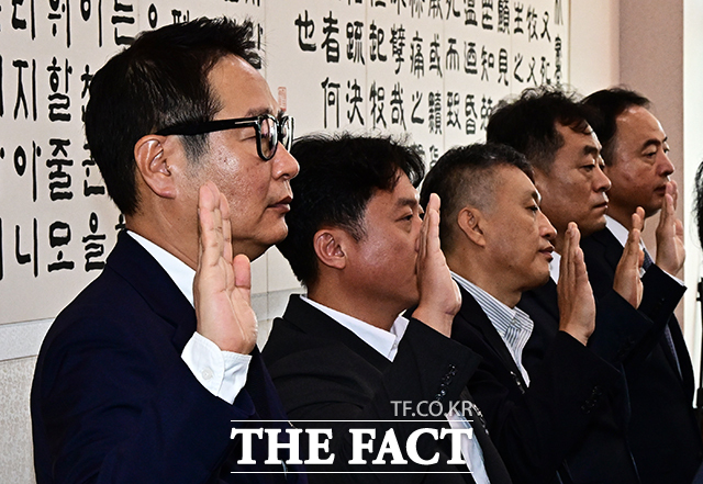 [더팩트ㅣ국회=배정한 기자] 김태형 21그램 대표(왼쪽)가 16일 오전 서울 여의도 국회 법제사법위원회에서 열린 감사원에 대한 국정감사에 출석해 증인선서를 하고 있다.