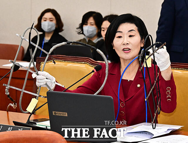 김희정 국민의힘 의원이 16일 오후 서울 여의도 국회 국토교통위원회에서 열린 한국도로공사 등에 대한 국정감사에 참석해 고속도로 동파 방지 열선 불량 문제에 대한 질의를 하고 있다. /국회=배정한 기자