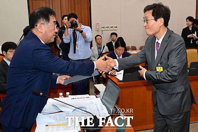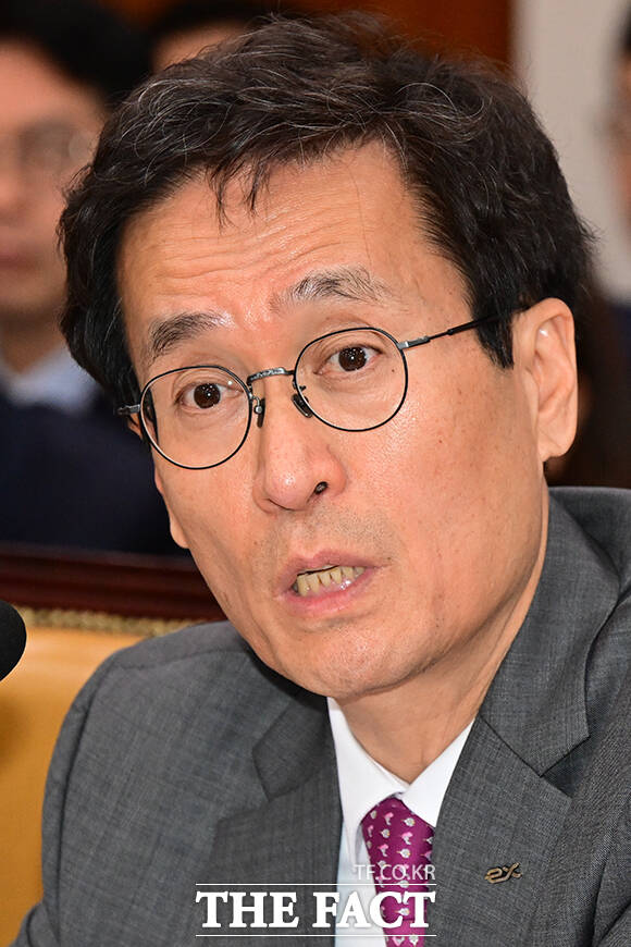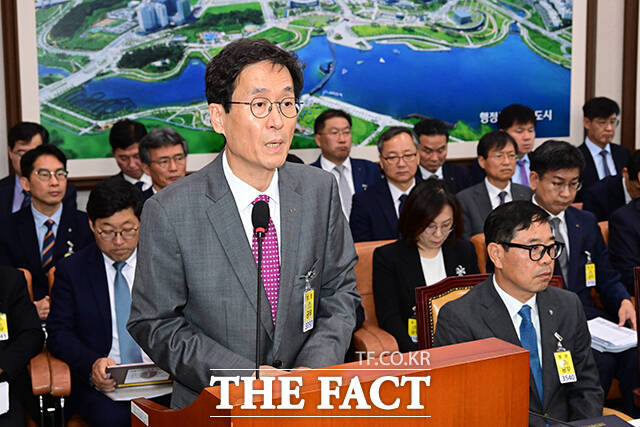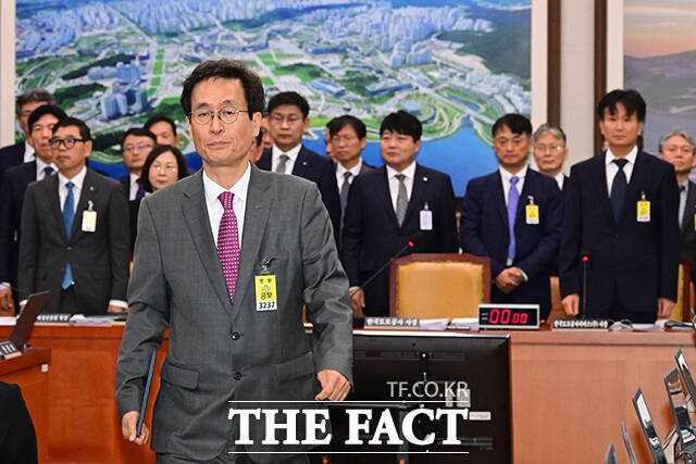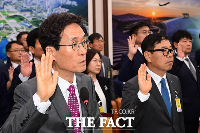 [더팩트ㅣ국회=남윤호 기자] 함진규 한국도로공사 사장이 16일 서울 여의도 국회에서 열린 국토교통위원회의 한국도로공사 등에 대한 국정감사에 출석해 증인 선서를 하고 있다.