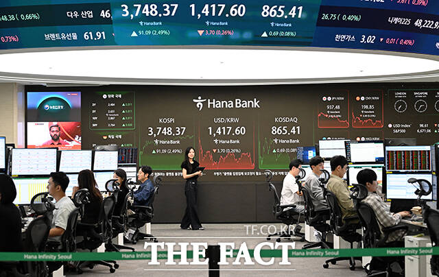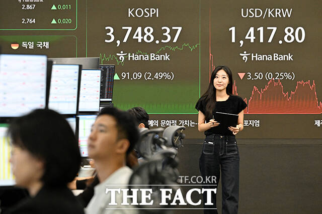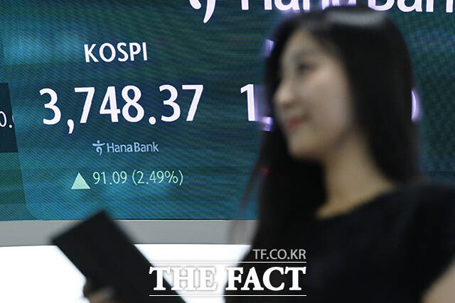 이날 코스피는 전 거래일 대비 91.09포인트(2.49%) 상승한 3748.37에 마감했다. 코스닥은 0.69포인트(0.08%) 상승한 865.41로, 원·달러 환율은 전 거래일 대비 3.4원 내린 1417.9원에 거래를 마쳤다.