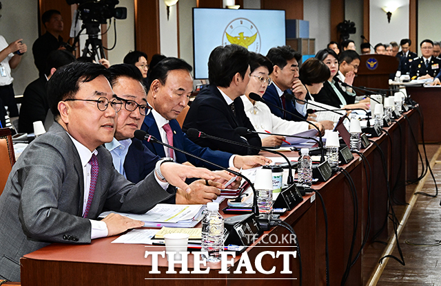 [더팩트ㅣ배정한 기자] 서범수 국민의힘 의원(왼쪽)이 17일 오전 서울 서대문구 경찰청에서 열린 행정안전위원회 국정감사에 참석해 의사진행 발언을 하고 있다.