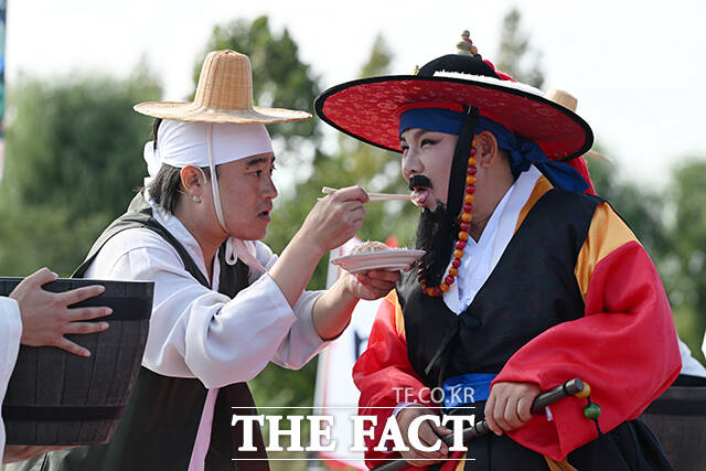 [더팩트ㅣ서예원 기자] 제18회 마포나루 새우젓축제가 17일 오전 서울 마포구 월드컵공원 평화광장 일대에서 열린 가운데 사또로 분장한 박강수 마포구청장(오른쪽)이 새우젓 감별을 재현하고 있다.