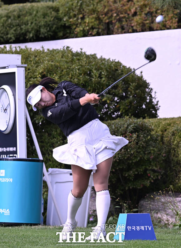 [더팩트ㅣ양주=이새롬 기자] 강채연이 17일 경기 양주 레이크우드CC에서 열린 KLPGA(한국여자프로골프)투어 '상상인·한경 와우넷 오픈 2025' 2라운드 경기에 참가해 18번홀에서 해저드 인근에 안착한 볼을 쳐내고 있다.