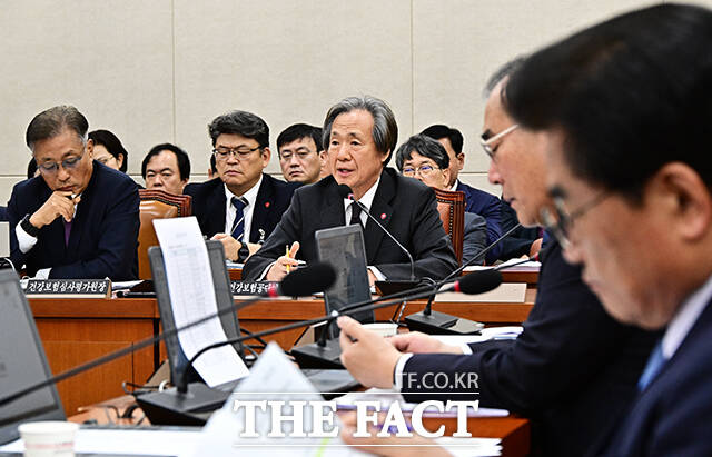 [더팩트ㅣ국회=배정한 기자] 정기석 국민건강보험공단 이사장이 17일 오후 서울 여의도 국회 보건복지위원회에서 열린 건강보험공단과 건강보험심사평가원에 대한 국정감사에 출석해 질의에 답변을 하고 있다.