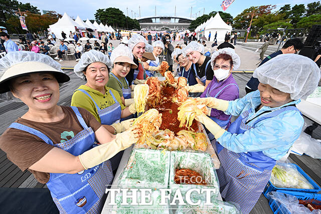 [더팩트ㅣ서예원 기자] 제18회 마포나루 새우젓축제가 17일 오후 서울 마포구 월드컵공원 평화광장 일대에서 열린 가운데 외국인들과 시민들이 김치 담그기 체험을 하고 있다.