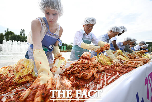 [더팩트ㅣ서예원 기자] 제18회 마포나루 새우젓축제가 17일 오전 서울 마포구 월드컵공원 평화광장 일대에서 열린 가운데 박강수 마포구청장(왼쪽에서 두 번째)이 외국인들과 함께 김치 담그기 체험을 하고 있다.