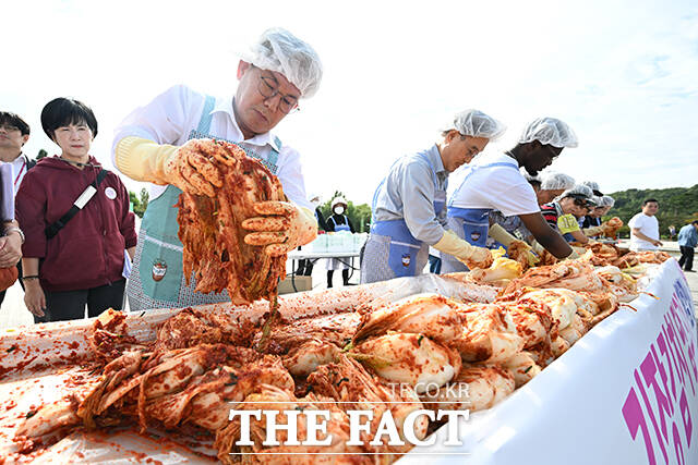 [더팩트ㅣ서예원 기자] 제18회 마포나루 새우젓축제가 17일 오전 서울 마포구 월드컵공원 평화광장 일대에서 열린 가운데 박강수 마포구청장(왼쪽)이 외국인들과 함께 김치 담그기 체험을 하고 있다.