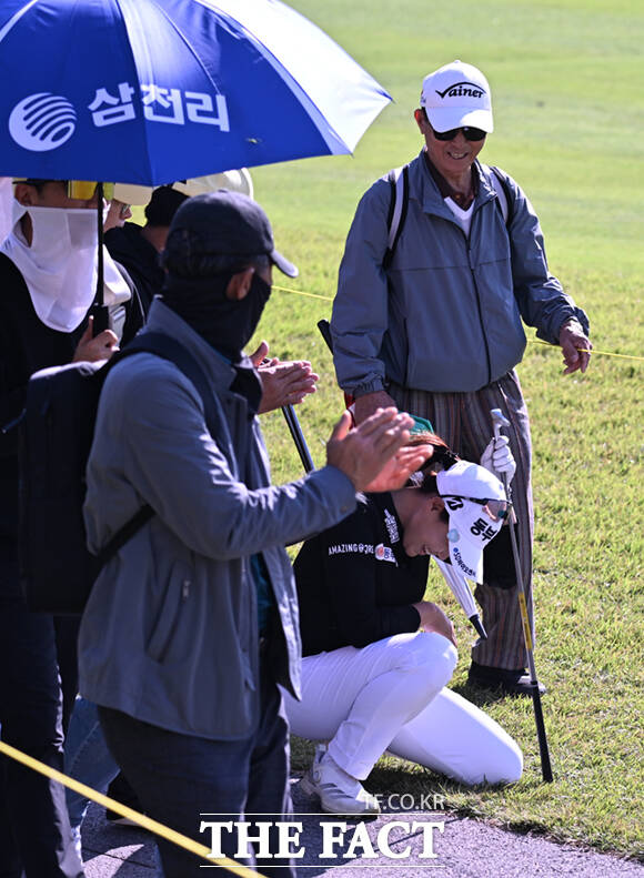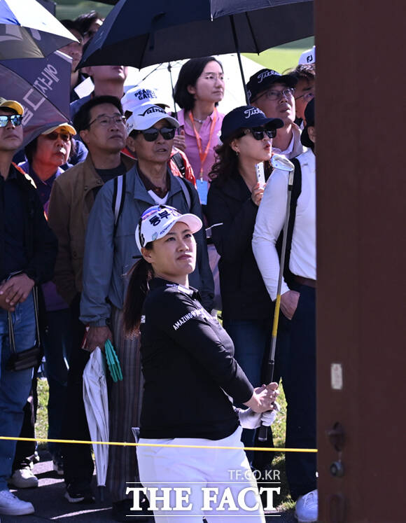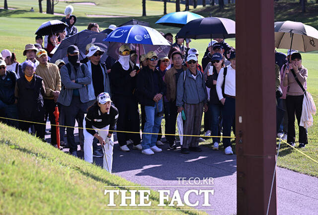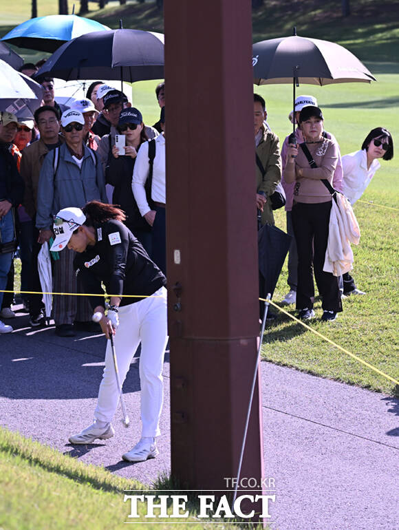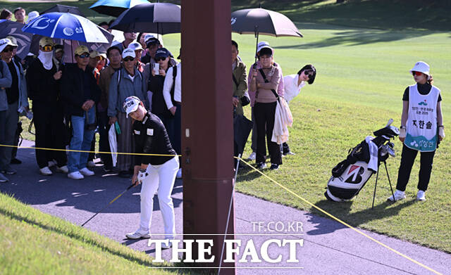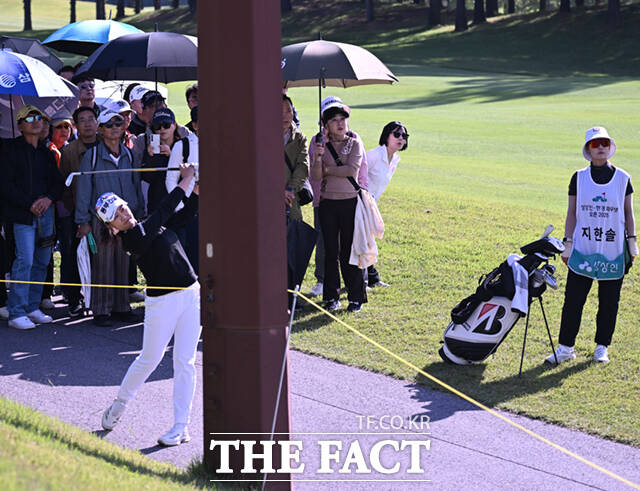 [더팩트ㅣ양주=이새롬 기자] 지한솔이 19일 경기 양주 레이크우드CC에서 열린 KLPGA(한국여자프로골프)투어 '상상인·한경 와우넷 오픈 2025' 최종라운드에서 18번홀 경기 도중 코스 밖에서 세컨샷을 하고 있다.
