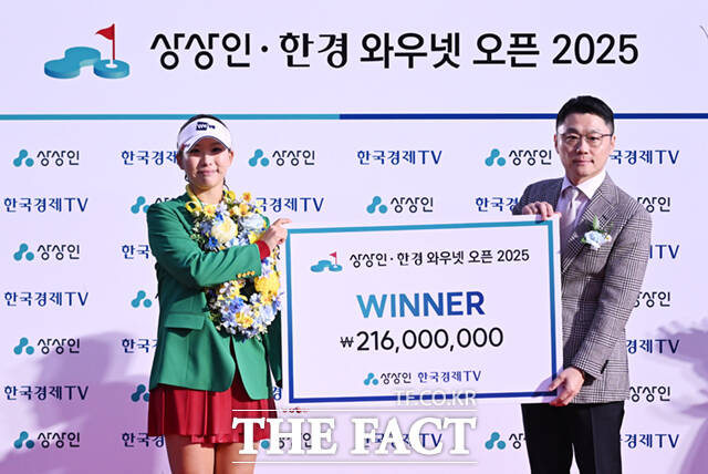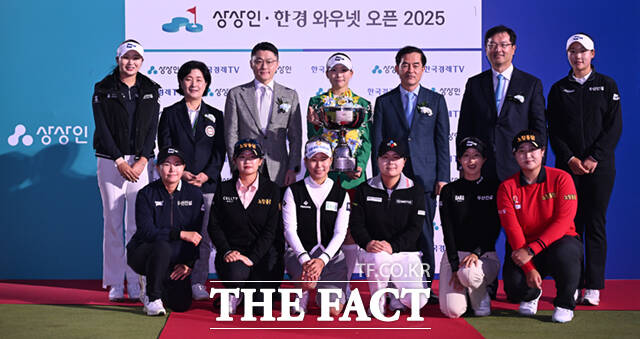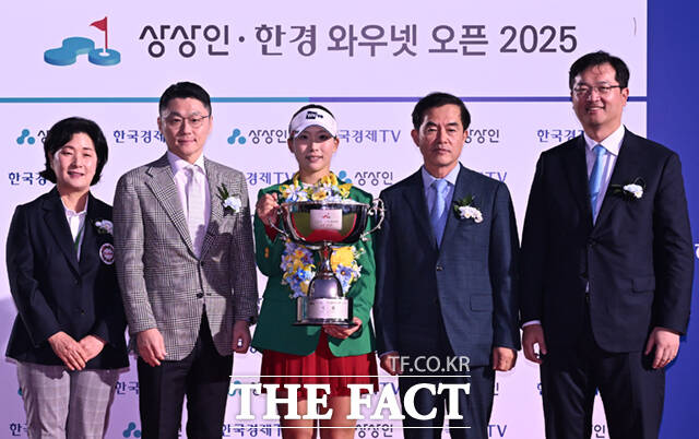 [더팩트ㅣ양주=이새롬 기자] 유준원 상상인그룹 대표가 19일 경기 양주 레이크우드CC에서 열린 KLPGA(한국여자프로골프)투어 '상상인·한경 와우넷 오픈 2025' 최종라운드에서 우승자 이율린에게 트로피를 전달하고 있다.