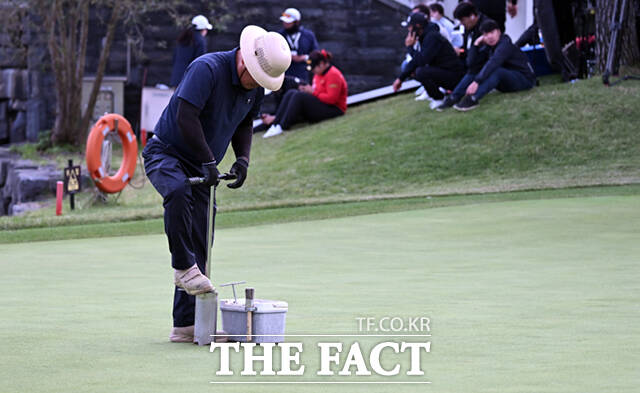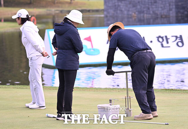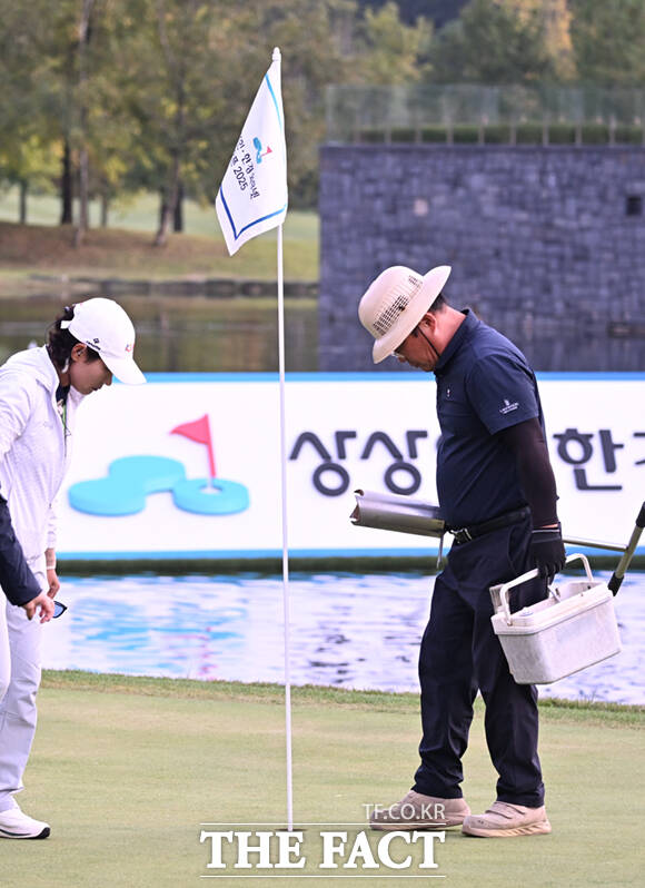 [더팩트ㅣ양주=이새롬 기자] 19일 경기 양주 레이크우드CC에서 KLPGA(한국여자프로골프)투어 '상상인·한경 와우넷 오픈 2025' 최종라운드가 열린 가운데, 박지영과 이율린이 여러차례 연장전에 돌입하자 관계자들이 난도 조정을 위해 18번홀 위치를 조정하고 있다.
