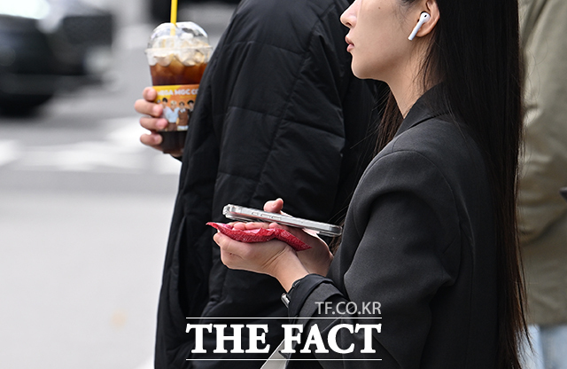 [더팩트ㅣ박헌우 기자] 전국 대부분 지역의 아침 기온이 떨어진 20일 오전 서울 종로구 세종대로사거리 일대에서 직장인이 핫팩을 손에 쥐고 있다.