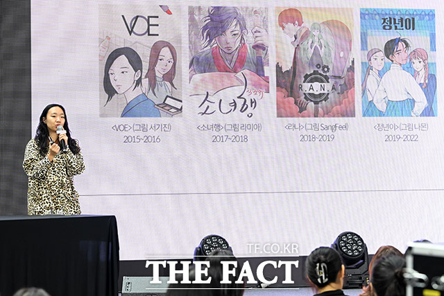[더팩트ㅣ남용희 기자] 서이레 웹툰 '정년이' 작가가 20일 오후 서울 송파구 롯데월드 아이스링크에서 열린 '2025 월드 웹툰 페스티벌'에서 '내 웹툰 스토리 드라마 만들기'를 주제로 토크 콘서트를 진행하고 있다.