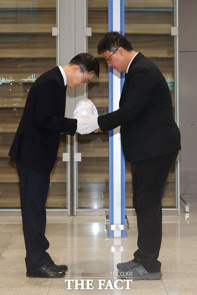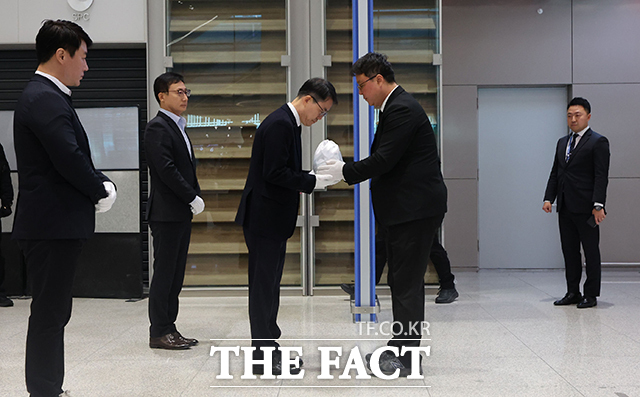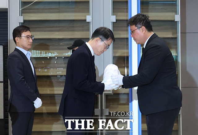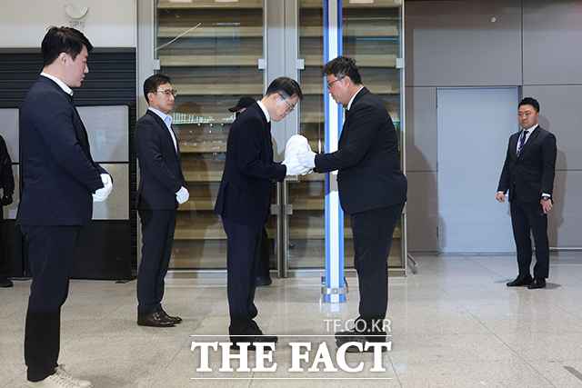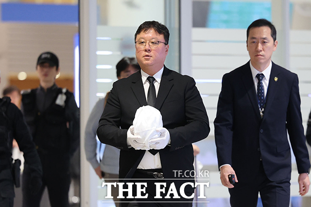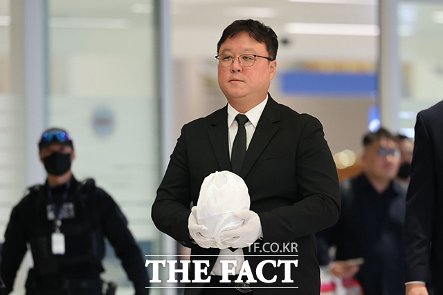 [더팩트ㅣ장윤석 기자] 캄보디아 범죄단지에서 고문을 당해 숨진 한국인 대학생 박 모 씨의 유해가 21일 오전 인천국제공항을 통해 송환돼 안중만 경북경찰청 형사기동대장에게 인수되고 있다.