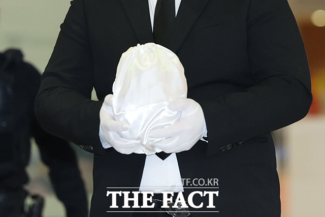 화장된 박 씨의 유해를 실은 항공편은 이날 오전 8시 4분쯤 인천국제공항에 도착했다. 지난 8월 8일 캄보디아에서 숨진 채 발견된 지 74일 만이다.