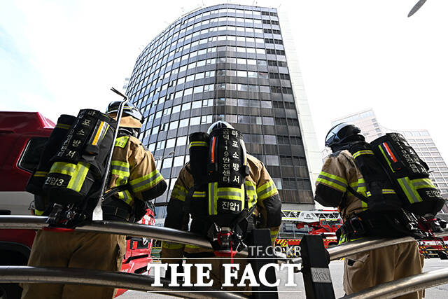 [더팩트ㅣ서예원 기자] 21일 오전 서울 중구 서울센터빌딩에서 화재가 발생해 진화 작업을 마친 소방대원들이 건물을 바라보고 있다.