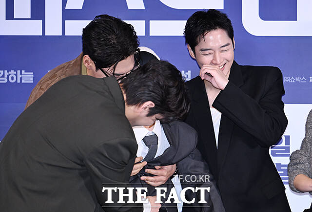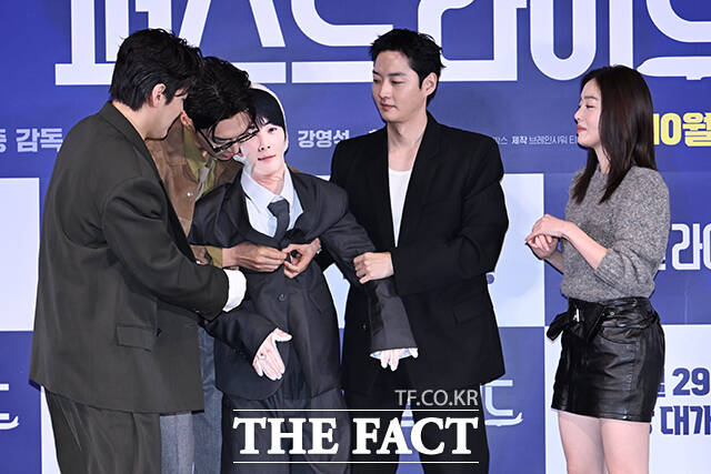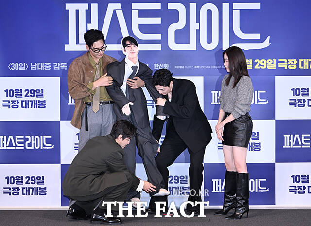 [더팩트ㅣ박헌우 기자] 배우 강하늘과 김영광, 차은우 인형, 강영석, 한선화(왼쪽부터)가 22일 오전 서울 용산구 CGV 용산 아이파크몰에서 열린 영화 '퍼스트 라이드' 언론 시사회 및 기자간담회에 참석해 포즈를 취하고 있다.