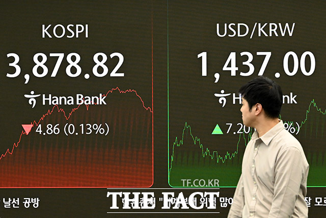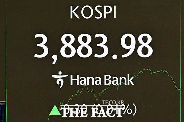 코스피 지수가 사상 처음으로 3900선을 돌파한 23일 오후 서울 중구 하나은행 딜링룸 전광판에 코스피 지수가 나타나고 있다. /남용희 기자