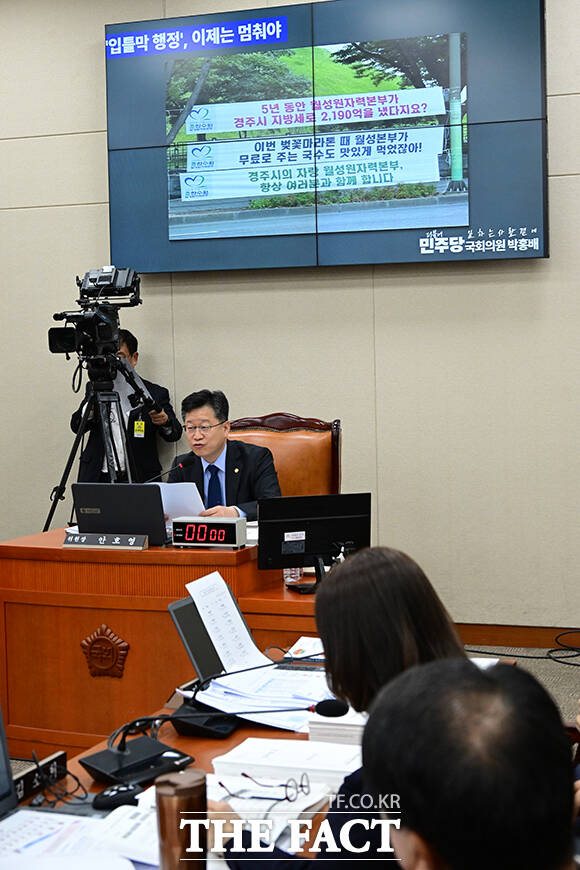 안호영 기후에너지환경노동위원장은 박 의원의 질의가 끝난 후 현수막 사진을 다시 확인하며 "참 황당한 문구"라면서 게시 취지를 물었다.