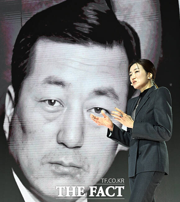 [더팩트ㅣ임영무 기자] 조현민 한진 사장이 23일 오후 서울 용산구 그랜드 하얏트 서울 그랜드볼룸에서 열린 한진그룹 80주년 기념행사에 참석해 조중훈 창업 회장의 사진을 배경으로 미래전략을 발표하고 있다.