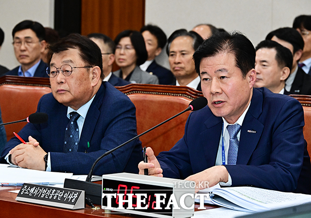 [더팩트ㅣ국회=배정한 기자] 강석진 중소벤처기업진흥공단 이사장(오른쪽)이 23일 오후 서울 여의도 국회 산업통상자원중소벤처기업위원회에서 열린 중소벤처기업진흥공단 등에 대한 국정감사에 출석해 질의에 답변을 하고 있다.