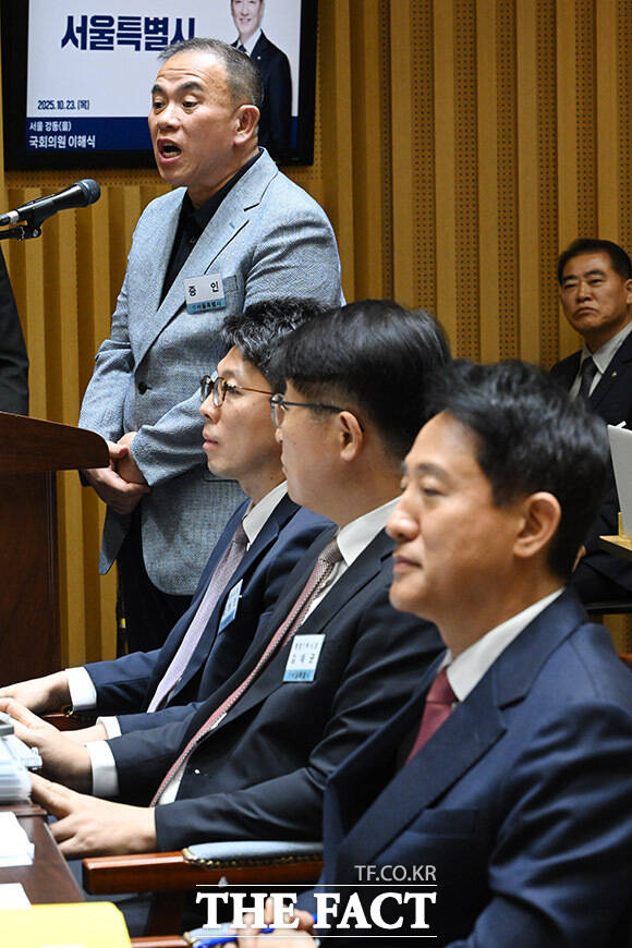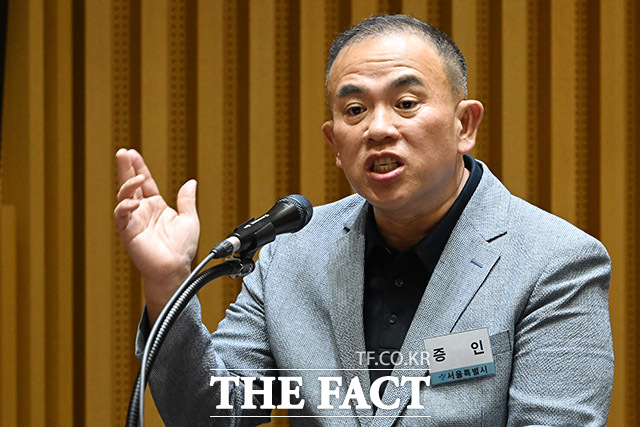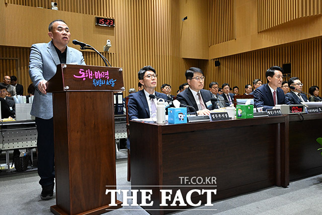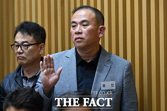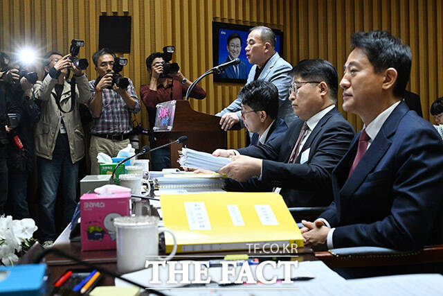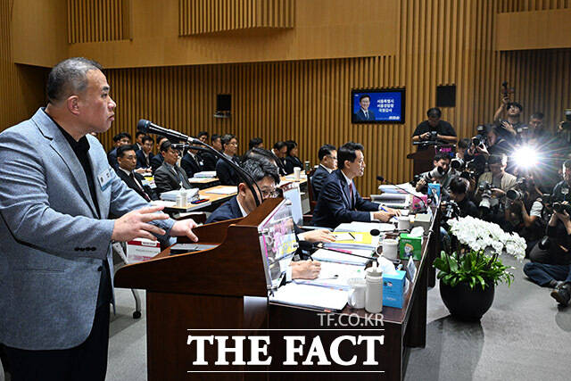 [더팩트ㅣ남용희 기자] '명태균 게이트' 의혹의 핵심 인물인 명태균 씨가 23일 오후 서울 중구 서울시청에서 열린 국회 행정안전위원회의 서울시청에 대한 국정감사에서 증인으로 출석해 오세훈 서울시장을 바라보며 의원 질의에 답하고 있다.