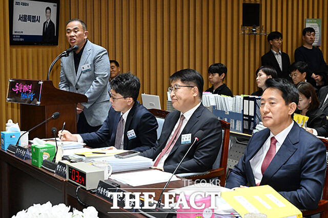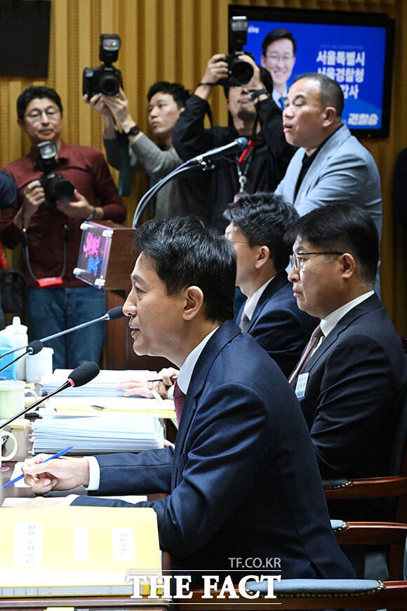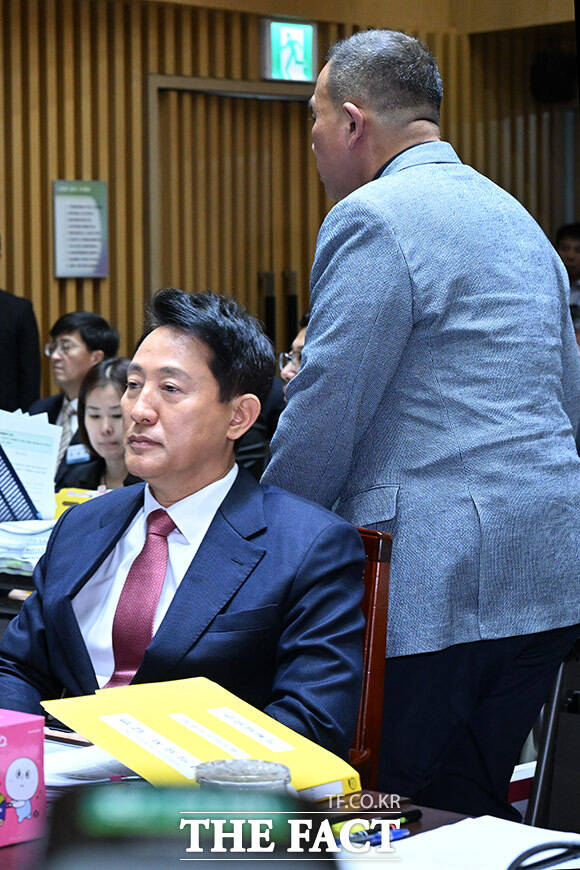 '여론조사 대납 의혹' 서울시청 국감에서 만난 오세훈-명태균 [TF사진관]