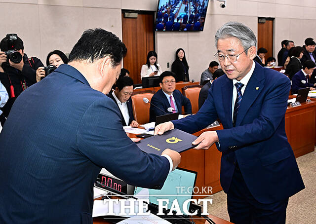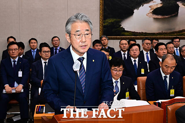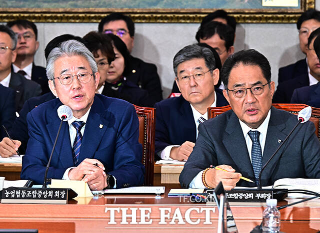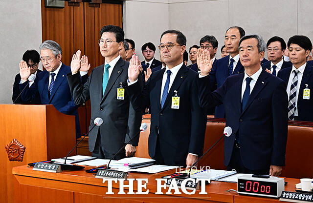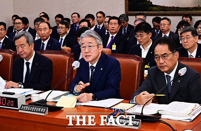 [더팩트 | 국회=배정한 기자] 강호동 농협중앙회장이 24일 오전 서울 여의도 국회 농림축산식품해양수산위원회에서 열린 농업협동조합중앙회, 한국마사회 등에 대한 국정감사에 출석해 질의에 답변을 하고 있다.