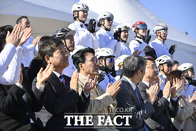 [더팩트ㅣ임영무 기자] 김민석 국무총리가 27일 오전 서울 여의도 한강공원 물빛무대에서 열린 자전거 신조선통신사 행사에 참석해 축사를 하고 있다.