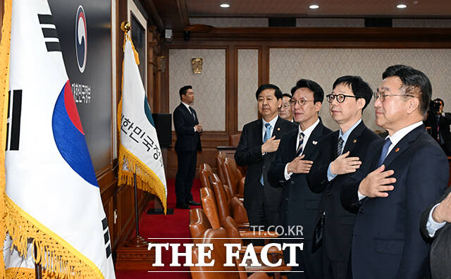 [더팩트ㅣ임영무 기자] 김민석 국무총리(오른쪽 세 번째)가 28일 오전 서울 종로구 정부서울청사에서 열린 국무회의에 참석해 국기에 대한 경례를 하고 있다.
