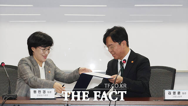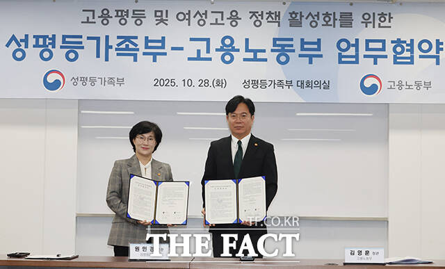 [더팩트ㅣ임영무 기자] 원민경 성평등가족부 장관(왼쪽)과 김영훈 고용노동부 장관이 28일 오전 서울 종로구 정부서울청사에서 열린 고용평등 및 여성고용 정책 활성화를 위한 노동부·성평등부 업무협약식에서 협약서를 교환 뒤 기념촬영을 하고 있다.