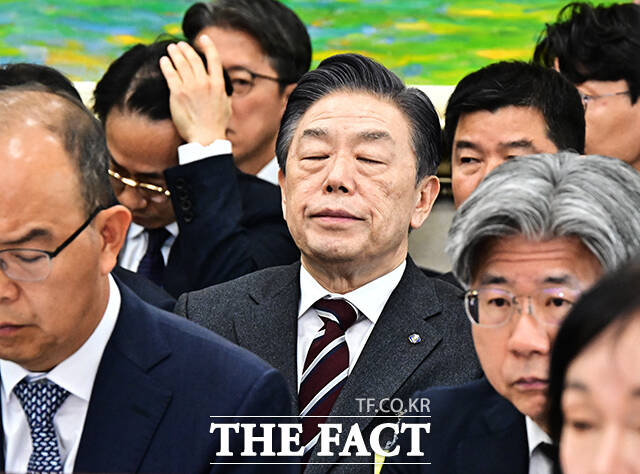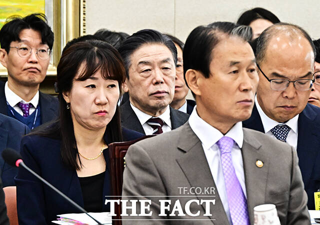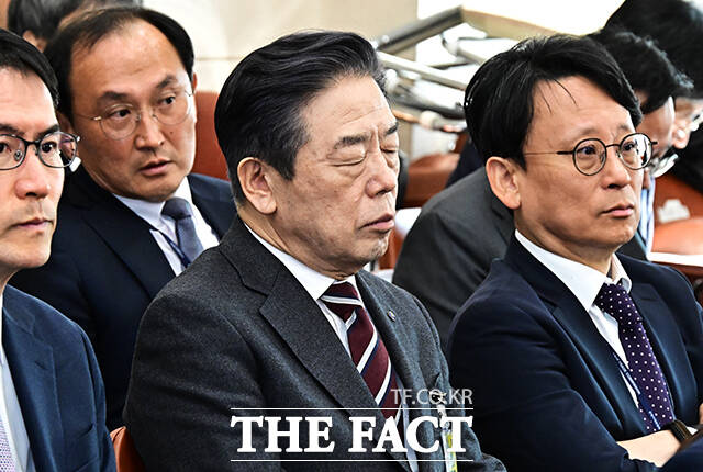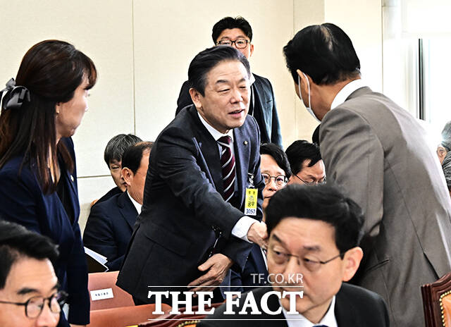 [더팩트ㅣ국회=배정한 기자] 김형석 독립기념관장(가운데)이 28일 오전 서울 여의도 국회 정무위원회에서 열린 국가보훈부, 국무조정실 등에 대한 종합감사에 출석해 권오을 국가보훈부 장관(오른쪽)과 인사를 하고 있다.