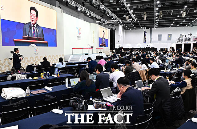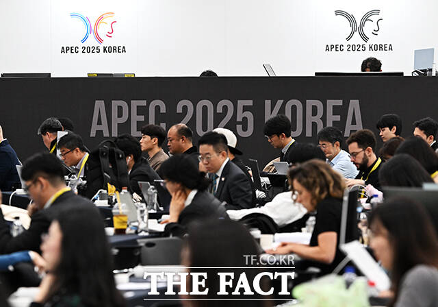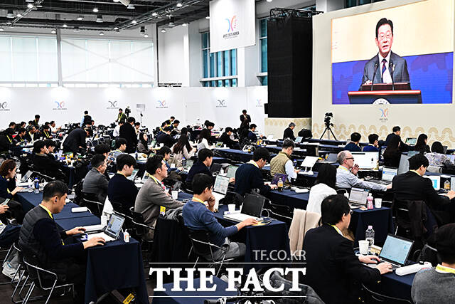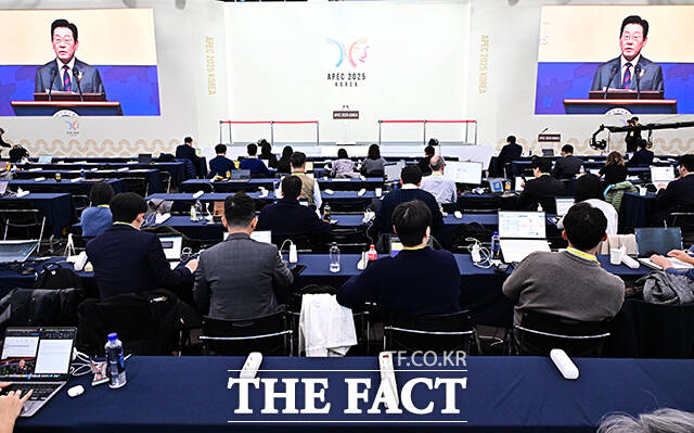 [더팩트ㅣ경주=배정한 기자] 2025 경주 아시아태평양경제협력체(APEC) 정상회의를 취재하기 위해 모인 각국의 취재진들이 29일 오전 경북 경주 보문단지 내 국제미디어센터(IMC)에서 이재명 대통령의 'APEC CEO(최고경영자) 서밋’ 특별연설을 시청하고 있다.