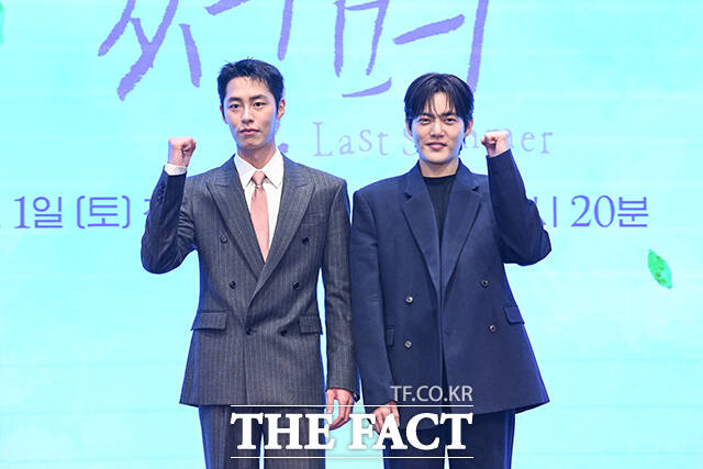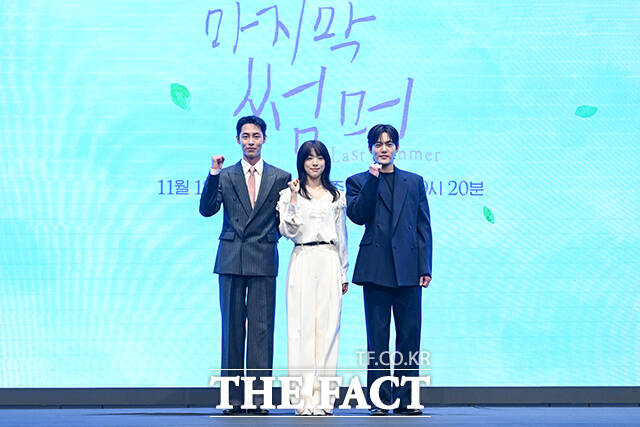 [더팩트ㅣ서예원 기자] 배우 이재욱과 최성은, 김건우(왼쪽부터)가 29일 오후 서울 구로구 신도림 더세인트 그랜드 볼룸에서 열린 KBS2 새 토일 미니시리즈 '마지막 썸머' 제작발표회에 참석해 포즈를 취하고 있다.