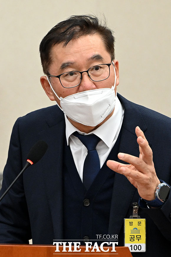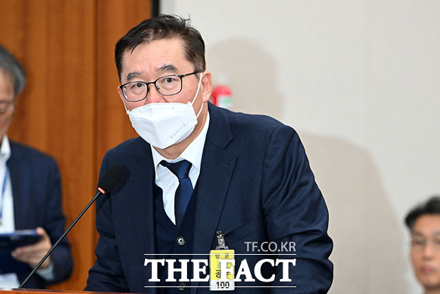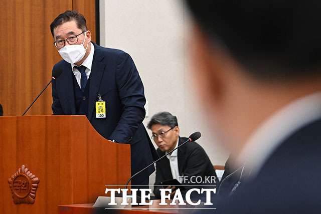 [더팩트ㅣ국회=남용희 기자] 남정운 한화솔루션 대표가 29일 오후 서울 여의도 국회에서 열린 산업통상자원중소벤처기업위원회 종합감사에 증인으로 참석해 의원 질의에 답하고 있다.