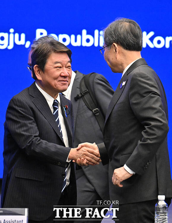 [더팩트ㅣ임영무 기자] 조현 외교부 장관(오른쪽)이 30일 오전 경북 경주시 소노캄 경주 그랜드볼룸에서 열린 2025 APEC 외교통상합동각료회의 개회식에 참석해 모테기 도시미쓰 일본 외무대신과 인사를 나누고 있다.