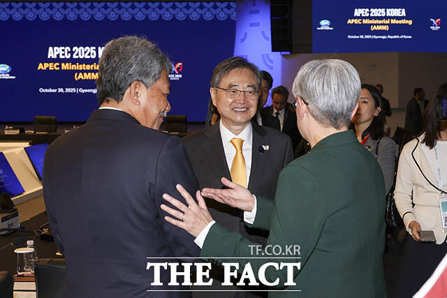 [더팩트ㅣ임영무 기자] 조현 외교부 장관(가운데)이 30일 오전 경주 소노캄에서 열린 APEC 외교통상합동각료회의에 참석해 각국 외교 장관들과 인사를 하고 있다.