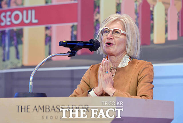 [더팩트ㅣ임영무 기자] 에밀리아 가토 주한 이탈리아 대사가 30일 서울 중구 앰배서더 서울 풀만 호텔에서 감베로 로쏘 '2025 TOP 이탈리안 와인 로드쇼'에 참석해 축사를 하고 있다.