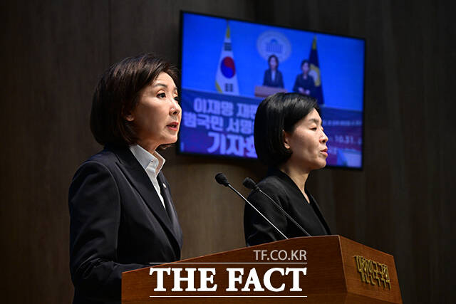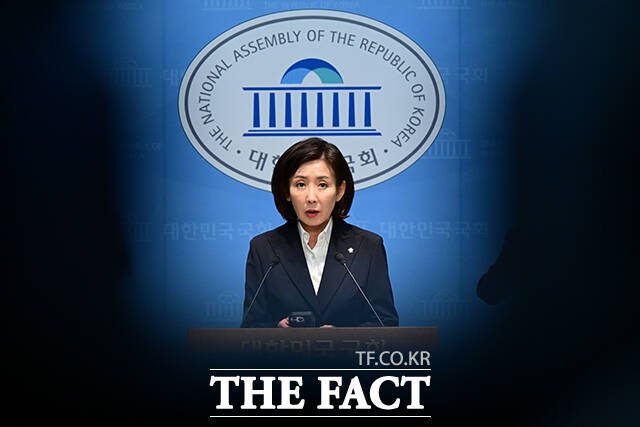 [더팩트ㅣ국회=남윤호 기자] 나경원 국민의힘 의원이 31일 서울 여의도 국회 소통관에서 법제사법위원회 국정감사와 관련해 기자회견을 열고 있다.