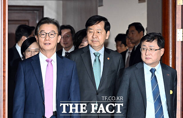 [더팩트ㅣ임영무 기자] 구윤철 부총리 겸 기획재정부 장관(가운데)과 전재수 해양수산부 장관, 김성환 기후에너지환경부 장관이 4일 오전 서울 종로구 정부서울청사에서 열린 경제관계장관회의 겸 물가관계장관회의 및 산업경쟁력강화 관계장관회의에 참석하고 있다.darkroom@tf.co.kr사진영상기획부 photo@tf.co.kr