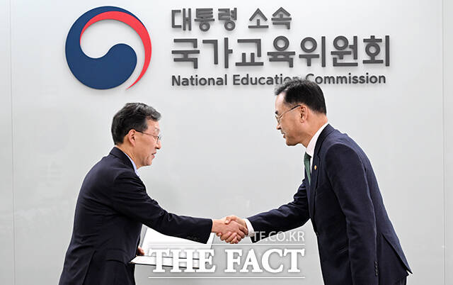 [더팩트ㅣ임영무 기자] 차정인 국가교육위원장(오른쪽)이 4일 오전 서울 종로구 정부서울청사에서 열린 인재강국 특별위원회 위촉식에 참석해 반상진 인재강국 특별위원회 위원장에게 위촉장을 수여하고 있다.