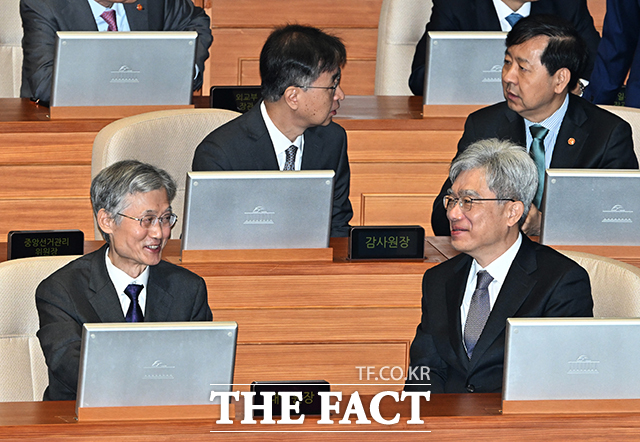 [더팩트ㅣ국회=배정한 기자] 조희대 대법원장(왼쪽)이 4일 오전 서울 여의도 국회에서 열린 본회의에 참석해 김상환 헌법재판소장과 대화를 하고 있다.
