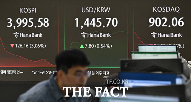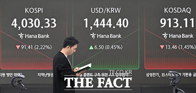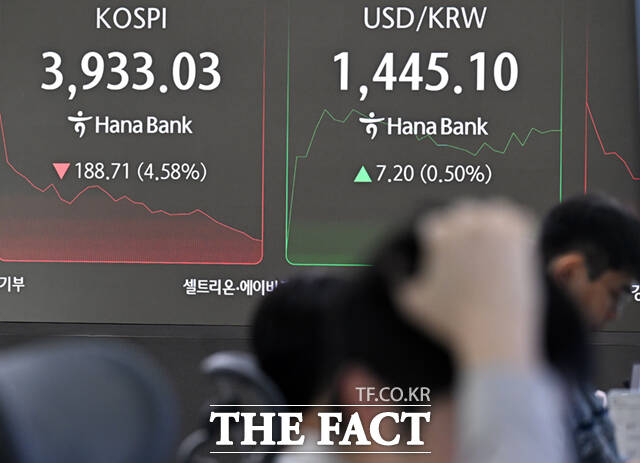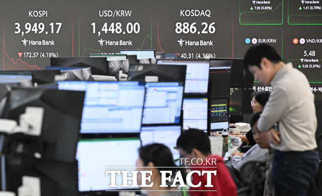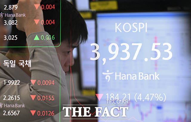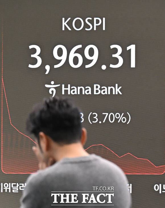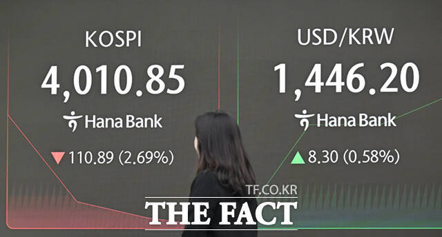 [더팩트ㅣ이새롬 기자] 코스피가 8거래일 만에 4000선을 내준 가운데 5일 오전 서울 중구 하나은행 딜링룸 전광판에 지수가 표시되고 있다.