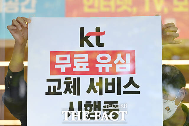 [더팩트ㅣ서예원 기자] KT가 전체 가입자 유심(USIM) 무상 교체에 나선 5일 오전 서울 영등포구 KT플라자 여의도역점에 무료 유심 교체 서비스 시행 안내문이 부착되고 있다.