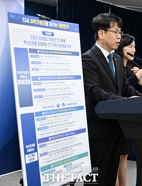 박인규 과학기술정보통신부 과학기술혁신본부장이 7일 오전 서울 종로구 정부서울청사에서 '과학기술 인재 미래 비전 제시 및 연구개발 혁신 생태계로의 도약' 방안과 관련해 브리핑하고 있다. /임영무 기자