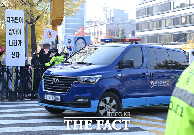 윤석열 전 대통령이 탑승한 호송차량이 7일 서울 서초구 서울중앙지방법원에서 열린 윤 전 대통령의 특수공무집행방해 등 혐의 속행 공판 출석을 위해 법원에 들어서고 있다. /이새롬 기자