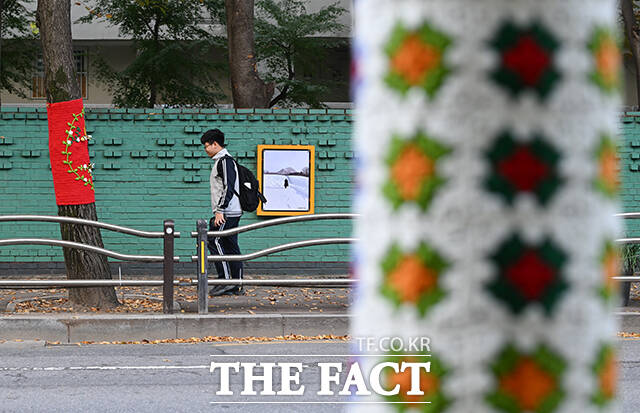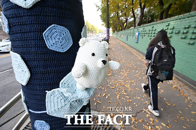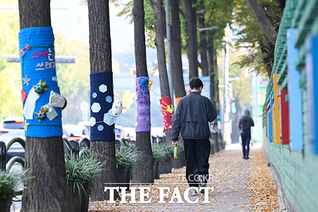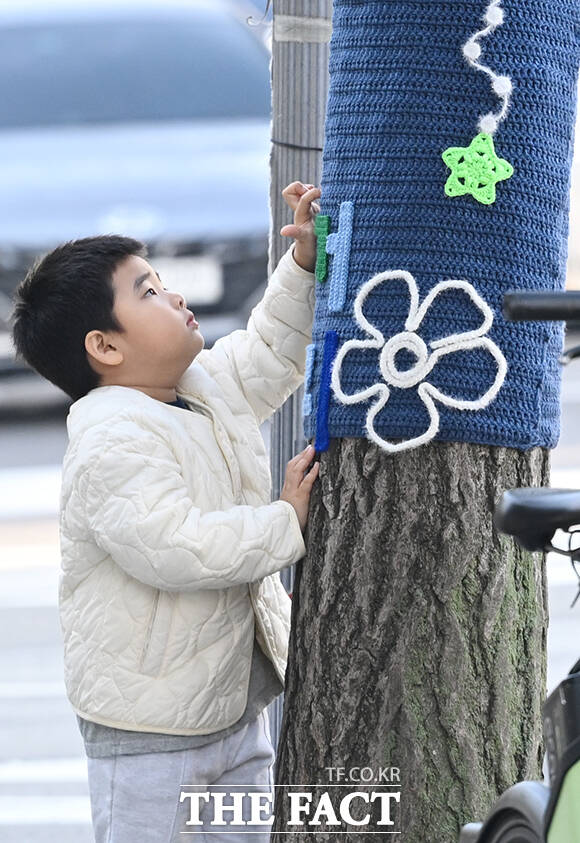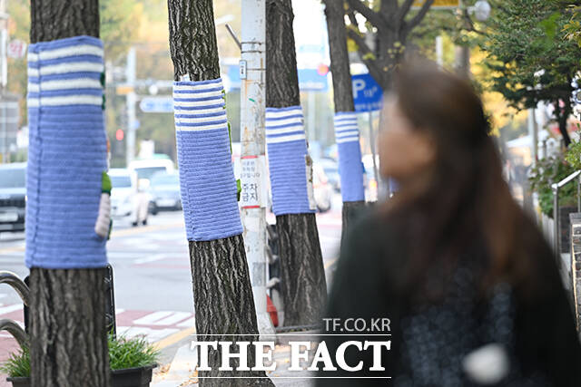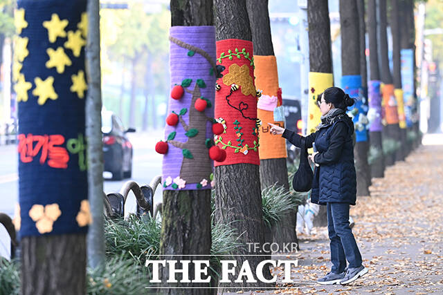 [더팩트ㅣ광명=서예원 기자] 절기상 겨울의 시작을 알리는 입동인 7일 오전 경기 광명시 하안동 하담길 예술의거리의 가로수들이 알록달록한 뜨개옷을 입고 있다.