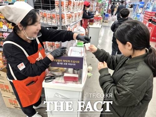 [더팩트ㅣ이효균 기자] 삼양식품은 '삼양1963' 출시를 기념해 7일 서울의 한 대형마트에서 시식행사를 진행했다. ‘삼양1963’은 우지와 팜유를 최적의 비율로 혼합한 골든블렌드 오일을 사용해 고소한 감칠맛을 극대화했다.