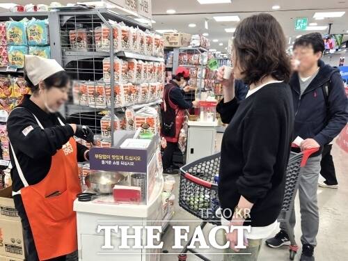 [더팩트ㅣ이효균 기자] 삼양식품은 '삼양1963' 출시를 기념해 7일 서울의 한 대형마트에서 시식행사를 진행했다. ‘삼양1963’은 우지와 팜유를 최적의 비율로 혼합한 골든블렌드 오일을 사용해 고소한 감칠맛을 극대화했다.